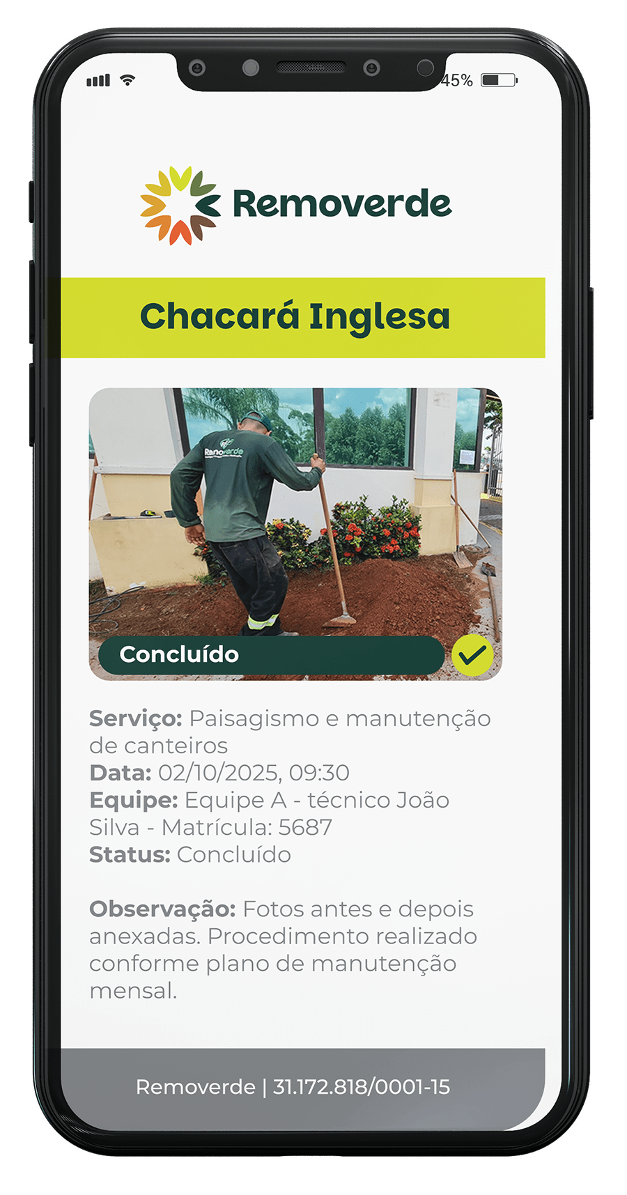A Removerde leva inovação para o cuidado com áreas verdes. Com nosso sistema exclusivo, você acompanha cada etapa do serviço em tempo real: fotos, relatórios e atualizações chegam direto no seu celular. Transparência, controle e tranquilidade para síndicos, administradoras e moradores.